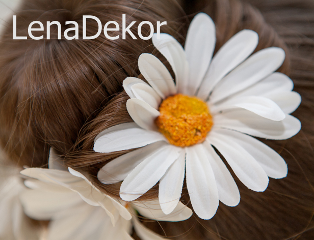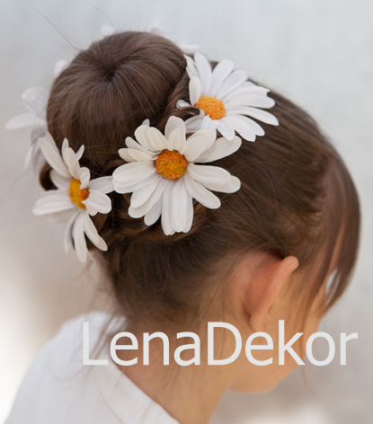 Piękna i efektowna ozdoba do włosów wykonana z główki kwiatowej sztucznej margaretki. Kwiatki z wyglądu zupełnie jak żywe. Wykonane z materiału, przymocowane do wsuwki do włosów. Niepowtarzalna ozdoba koka lub innego upięcia. Średnica kwiatka wynosi ok 8 cm. Cena dotyczy jednej sztuki czyli jednego kwiatka.