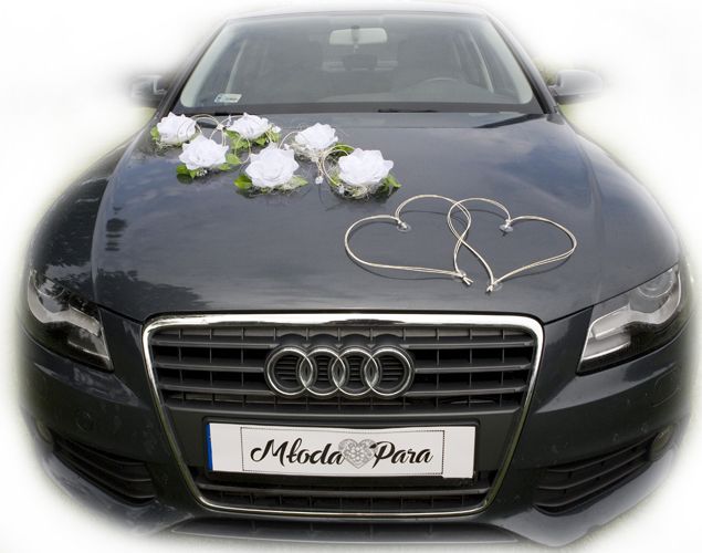 Zdjęcia przedstawiają kompletną dekorację NINA. Ozdobę możesz zamocować na wiele innych sposobów. Jest uniwersalna. Łatwo dopasujesz ją do każdego samochodu. Zestaw składa się z wielu osobnych elementów, które można dowolnie ze sobą komponować. Do przystrojenia samochodu pokazanego na zdjęciach wykorzystaliśmy tylko jeden zestaw NINA. Kokardy nie wchodzą w skład zestawu. Można je dokupić w naszym sklepie.