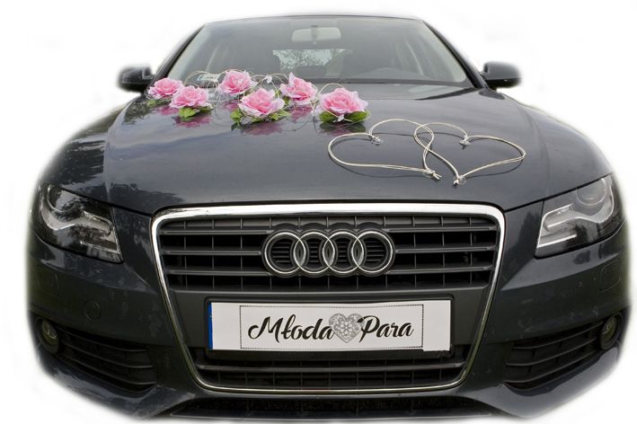 Zdjęcia przedstawiają kompletną dekorację NINA. Ozdobę możesz zamocować na wiele innych sposobów. Jest uniwersalna. Łatwo dopasujesz ją do każdego samochodu. Zestaw składa się z wielu osobnych elementów, które można dowolnie ze sobą komponować. Do przystrojenia samochodu pokazanego na zdjęciach wykorzystaliśmy tylko jeden zestaw NINA. Kokardy nie wchodzą w skład zestawu. Można je dokupić w naszym sklepie.