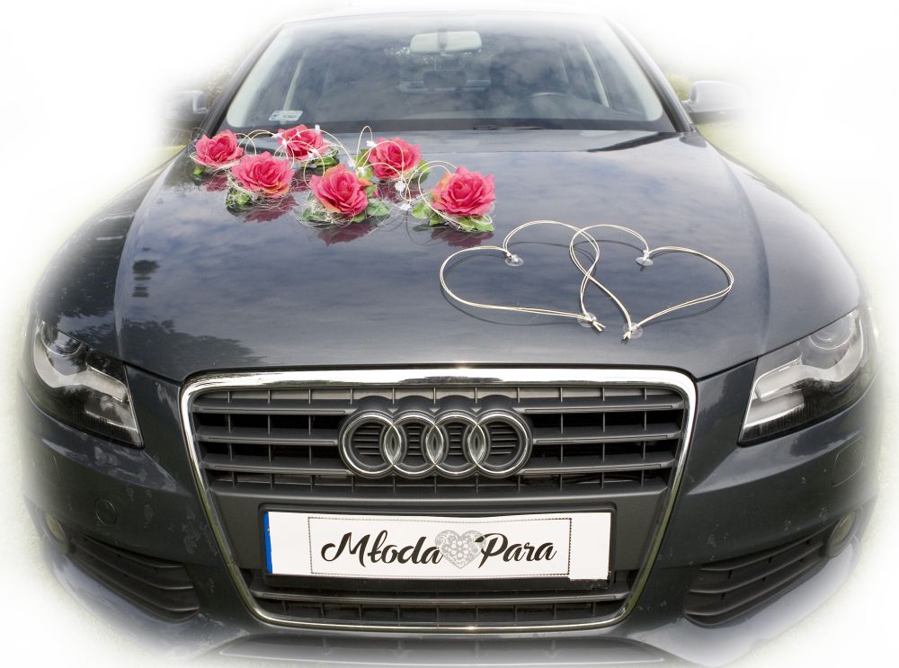 Zdjęcia przedstawiają kompletną dekorację NINA. Ozdobę możesz zamocować na wiele innych sposobów. Jest uniwersalna. Łatwo dopasujesz ją do każdego samochodu. Zestaw składa się z wielu osobnych elementów, które można dowolnie ze sobą komponować. Do przystrojenia samochodu pokazanego na zdjęciach wykorzystaliśmy tylko jeden zestaw NINA. Kokardy nie wchodzą w skład zestawu. Można je dokupić w naszym sklepie.