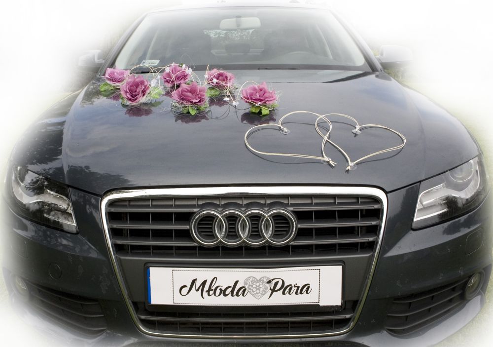 Zdjęcia przedstawiają kompletną dekorację NINA. Ozdobę możesz zamocować na wiele innych sposobów. Jest uniwersalna. Łatwo dopasujesz ją do każdego samochodu. Zestaw składa się z wielu osobnych elementów, które można dowolnie ze sobą komponować. Do przystrojenia samochodu pokazanego na zdjęciach wykorzystaliśmy tylko jeden zestaw NINA. Kokardy nie wchodzą w skład zestawu. Można je dokupić w naszym sklepie.